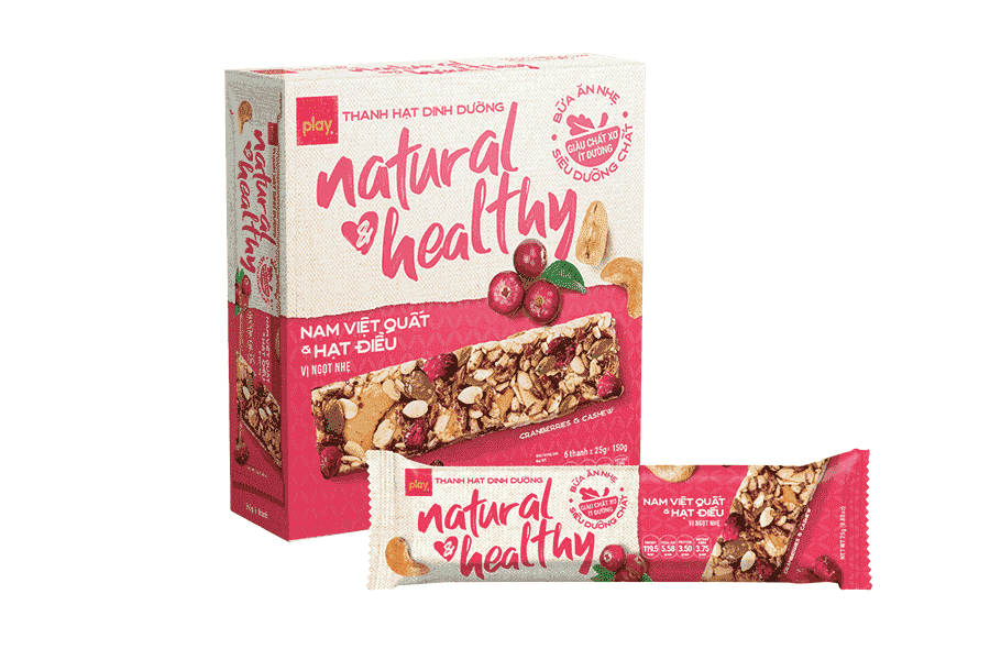Thanh hạt dinh dưỡng PLAY Natural & Healthy là món ăn vặt ưa thích và là lựa chọn lý tưởng cho những người quan tâm đến chế độ ăn uống lành mạnh, đặc biệt là người ăn kiêng. Sản phẩm được chế biến từ các loại hạt giàu dưỡng chất, cung cấp năng lượng tích cực cho cơ thể một cách tự nhiên.